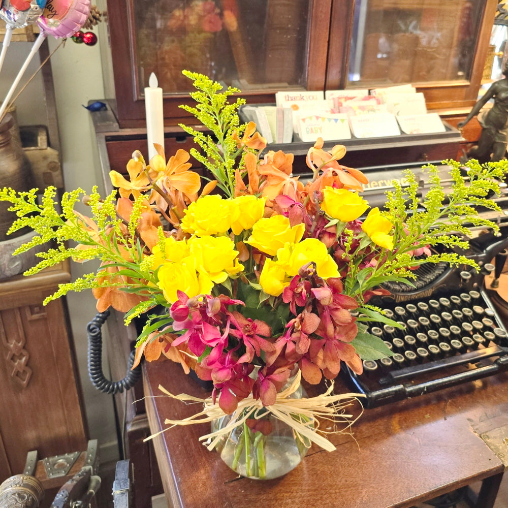 Introducing Mystic Flowers "The Autumn Radiance Flower Bouquet" , thoughtfully designed to bring the warm and vibrant colors of fall into your space. This stunning arrangement, elegantly presented in a clear glass vase, features a harmonious combination of iconic fall blooms, including sunflowers, orange lilies, fall tone carnations. Accented with greens to create a captivating flower arrangement that exudes the essence of autumn.