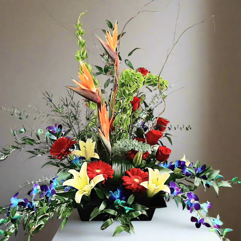 Experience the beauty of nature with this stunning, colorful arrangement. Featuring the vibrant elegance of Birds of Paradise, the passionate allure of Red Roses, the cheerful charm of Gerberas, the pristine grace of White Lilies, and the exotic touch of Blue Dendrobium Orchids, this bouquet is a masterpiece of artistry. Accentuated with Bells of Ireland, Italian Ruscus, and lush greens, it creates a harmonious blend of textures and colors that exude sophistication and vibrancy. Perfect for any occasion, this arrangement brings an exotic, lively touch to your space or celebration.