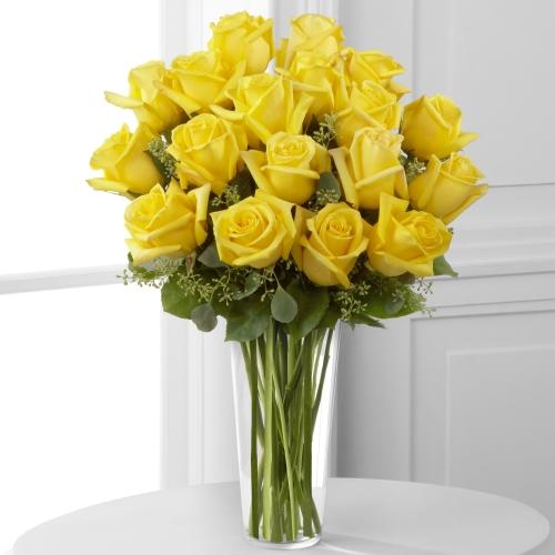 Our Yellow Rose Bouquet is a shining way to offer hope and warmth to those facing the loss of a loved one. Sunlit yellow roses are arranged with seeded eucalyptus in a clear glass vase to create the perfect gift of caring kindness and sympathy. GOOD version includes one dozen roses. BETTER version includes 18 roses. BEST version includes 24 roses.
